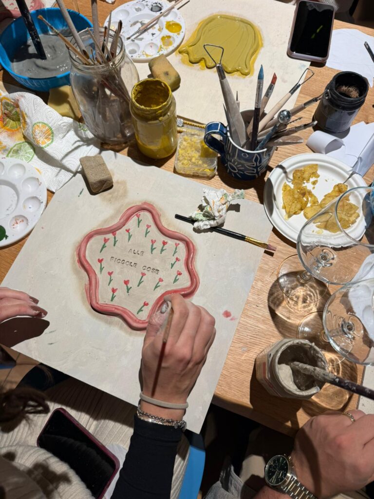 Modellazione e decorazione di una tazza in argilla con degustazione di vino.